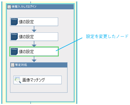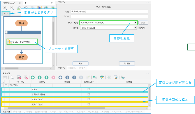 | 変更 | 緑 | 比較対象のシナリオ内には存在しているが、設定内容が変更されていると判定された要素は緑色の枠線で表示されます。ユーザがプロパティ画面で視認することが容易な項目は変更として表示します。 |