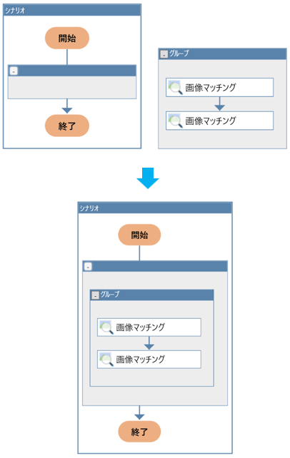 記録が完了するとフローチャートエリアに新しくグループが作成され、その中に画像マッチングノードがあります。