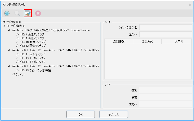 この画面にはウィンドウ識別名と、それを使用しているノードがツリー状に表示されます。